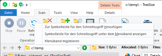 TreeSizeに表示されている任意のコマンドをクイックアクセスツールバーに追加できます。